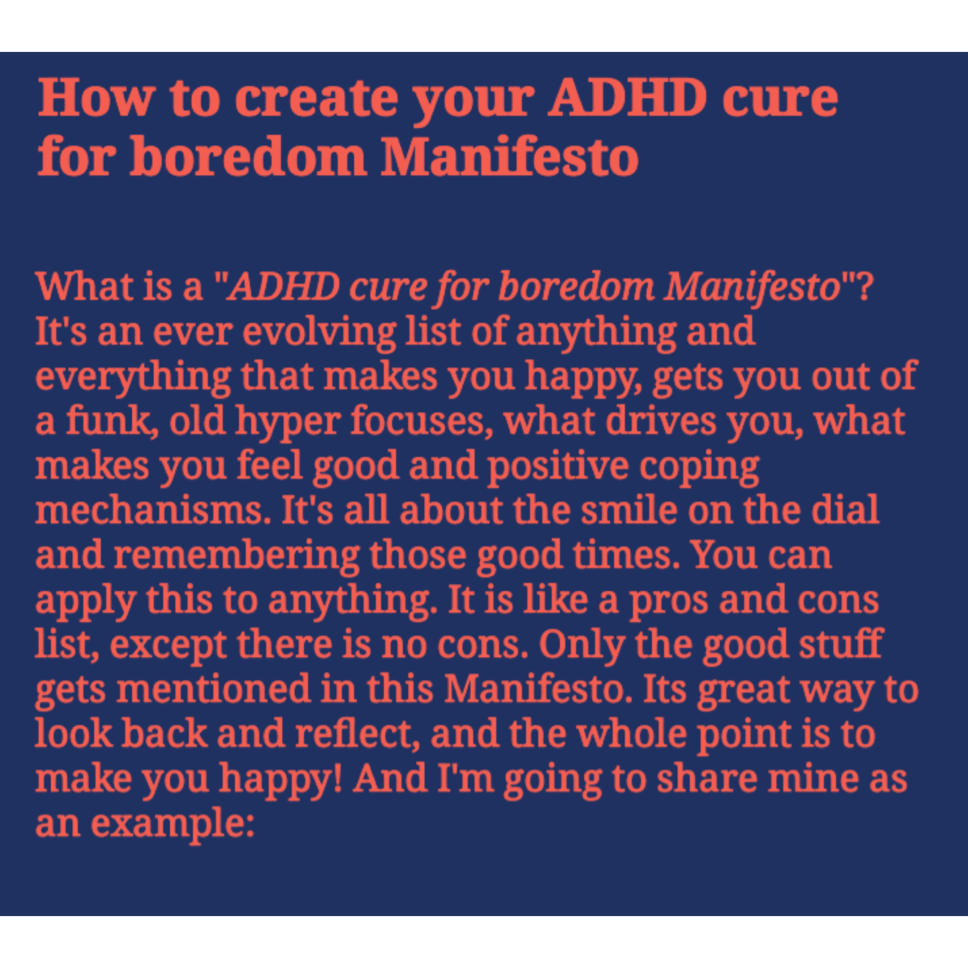 What is a “ADHD cure for boredom Manifesto“? It’s an ever evolving list of anything and everything that makes you happy, gets you out of a funk, old hyper focuses, what drives you, what makes you feel good and positive coping mechanisms. It’s all about the smile on the dial and remembering those good times. You can apply this to anything. It is like a pros and cons list, except there is no cons. Only the good stuff gets mentioned in this Manifesto. Its great way to look back and reflect, and the whole point is to make you happy! And I’m going to share mine as an example: