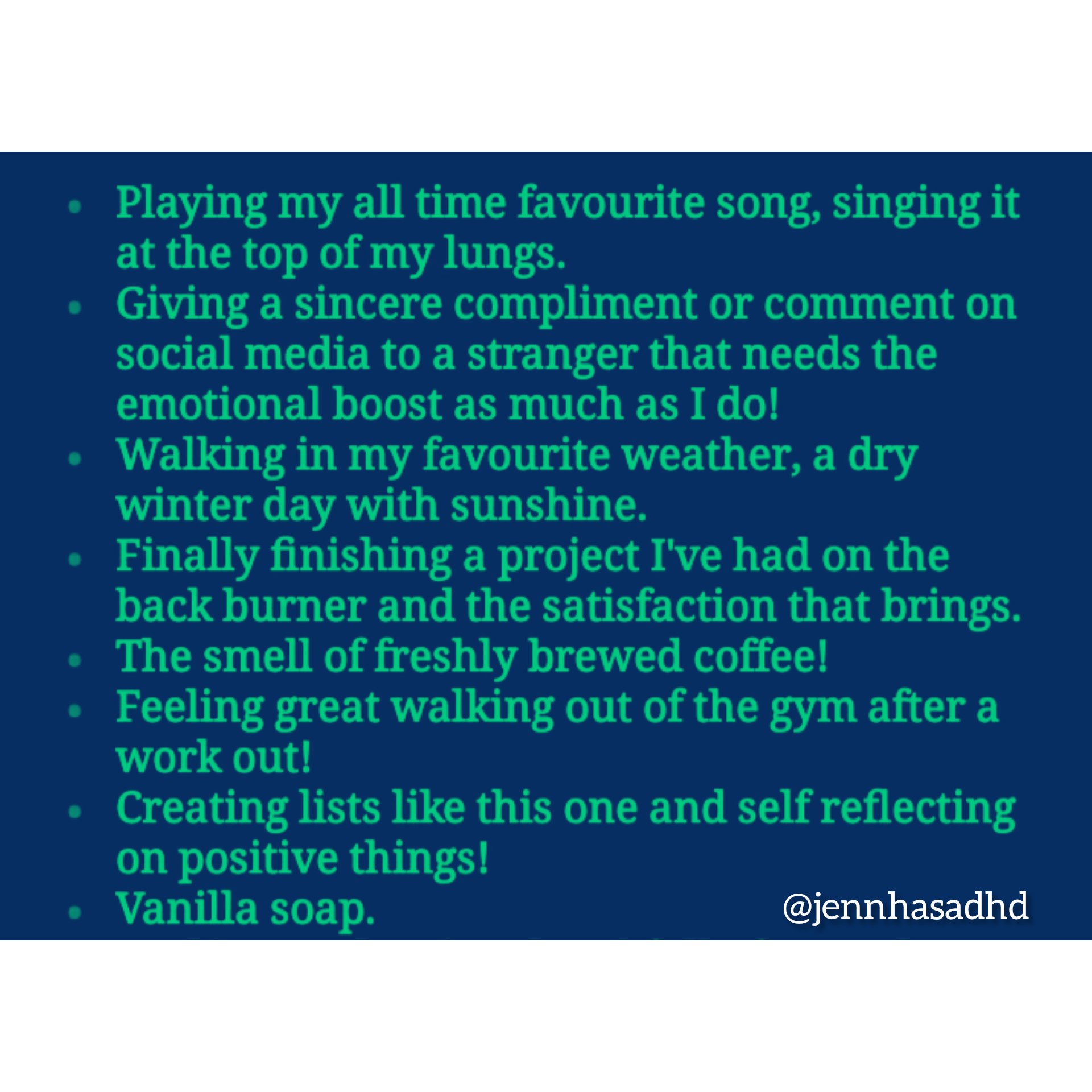 - Creating lists like this one and self reflecting on positive things!