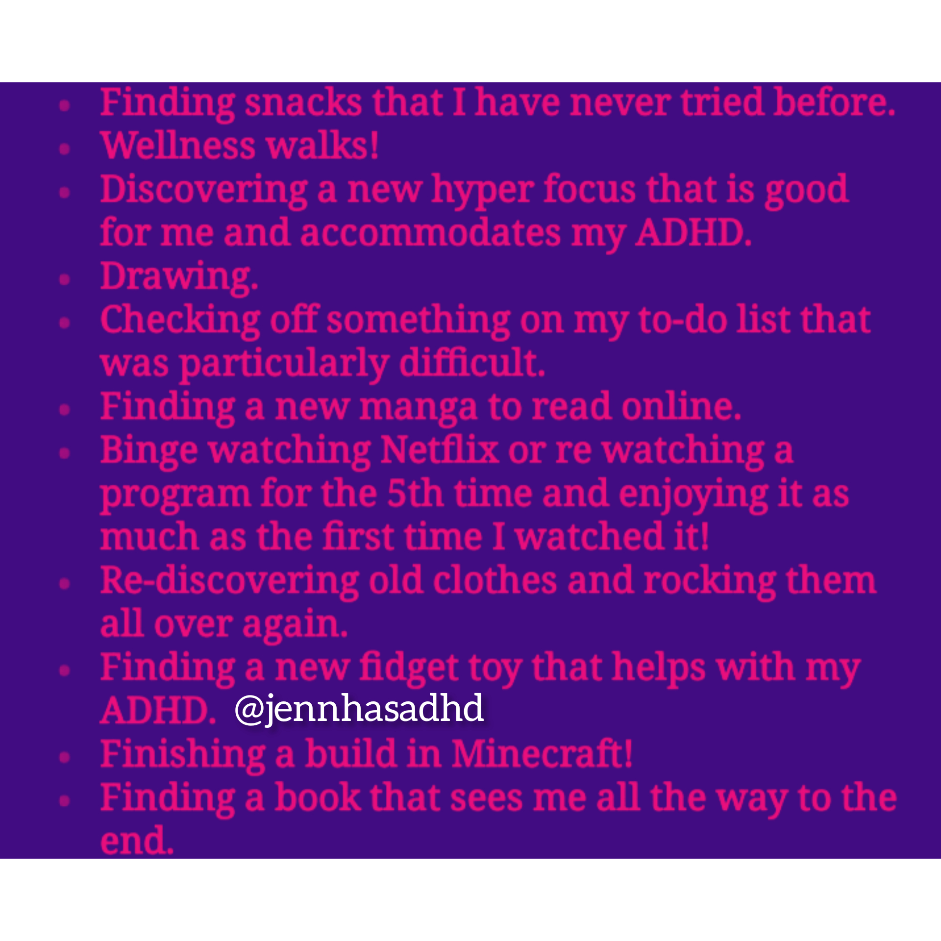 - Discovering a new hyper focus that is good for me and accommodates my ADHD.