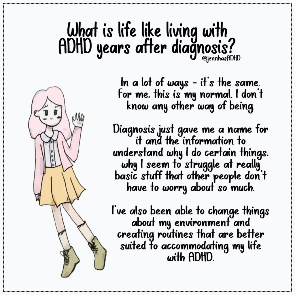 In a lot of ways – it’s the same. For me, this is my normal. I don’t know any other way of being. Diagnosis just gave me a name for it and the information to understand why I do certain things, why I seem to struggle at really basic stuff that other people don’t have to worry about so much. I’ve also been able to change things about my environment and creating routines that are better suited to accommodating my life with ADHD.