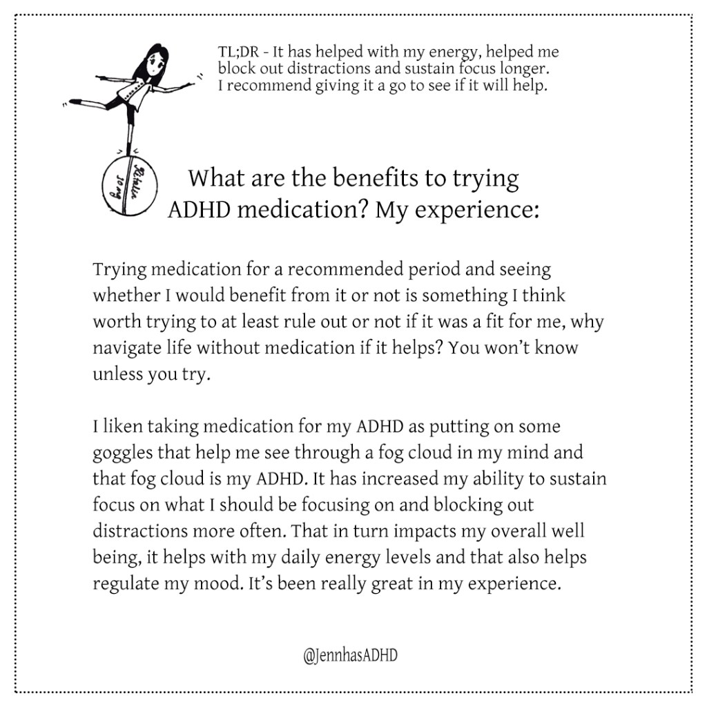 Other information I have read about ADHD medication is not every ADHD person responds to it, so that means there will need to be alternatives to medication used either way. Medication is not a fix, but it certainly improved my life quality in general and makes things so much easier. Environment and basic pillar care is still paramount in order for your medication to be most effective too.